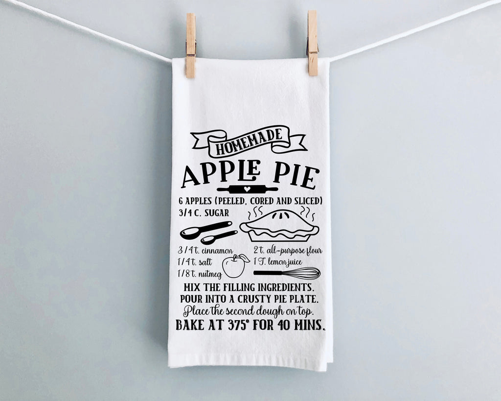 Bring some whimsy charm to your kitchen with our Whimsy Farmhouse Style Apple Pie Recipe Towel! Made from 100% cotton, this 28” x 28” towel features a vibrant, full-color or...Bring some whimsy charm to your kitchen with our Whimsy Farmhouse Style Apple Pie Recipe Towel! Made from 100% cotton, this 28” x 28” towel features a vibrant, full-color or black and white design of a classic apple pie recipe. Perfect for gifting on any occasion—housewarming, wedding, Christmas, birthdays, or just because! Functional and decorative, it’s a timeless addition to any home.